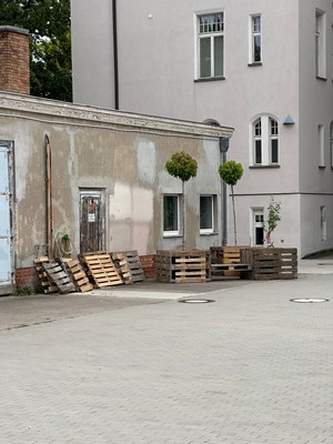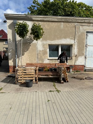 Dazu wurde vom 15.9. bis 17.9.25 Holz gesägt, geschliffen, gestrichen, um Sitzbänke zu bauen und Bäume in große Pflanzkübel gepflanzt für Schatten an heißen Tagen.
