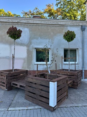 Dazu wurde vom 15.9. bis 17.9.25 Holz gesägt, geschliffen, gestrichen, um Sitzbänke zu bauen und Bäume in große Pflanzkübel gepflanzt für Schatten an heißen Tagen.